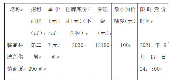 2、競租保證金:報名參與競租標的需繳納相應(yīng)的保證金,公告期內(nèi)須繳納到指定賬戶(報名后我司提供賬戶信息),競租保證金在確定為承租方后用于支付租賃押金等費用,剩余保證金多退少補。如未競得,保證金在三個工作日內(nèi)無息退還。